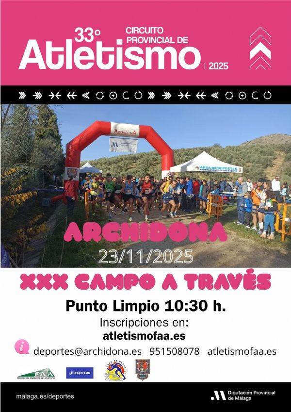 El XXX Cross "Ciudad de Archidona" se celebrará el domingo 23 de noviembre de 2025 en el Paraje Punto Limpio de Archidona, Málaga. La prueba, que forma parte del Circuito Provincial de Campo a Través de la Diputación de Málaga, incluirá diversas categorías y distancias, con una prueba absoluta de 6.000 metros. Las inscripciones, que finalizan el 17 de noviembre, deben realizarse en atletismofaa.es y tienen un coste de 1,5 € por atleta. Para más información, consulte la página web del organizador.