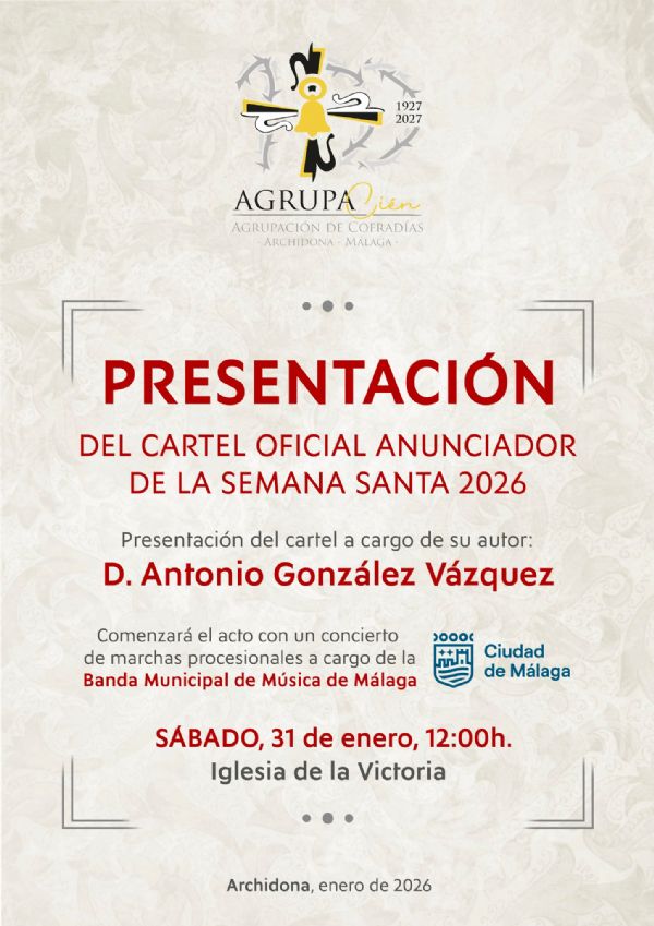 El sábado 31 de enero tendrá lugar la presentación del Cartel anunciador de la Semana Santa de Archidona, obra del autor local Antonio González Vázquez.